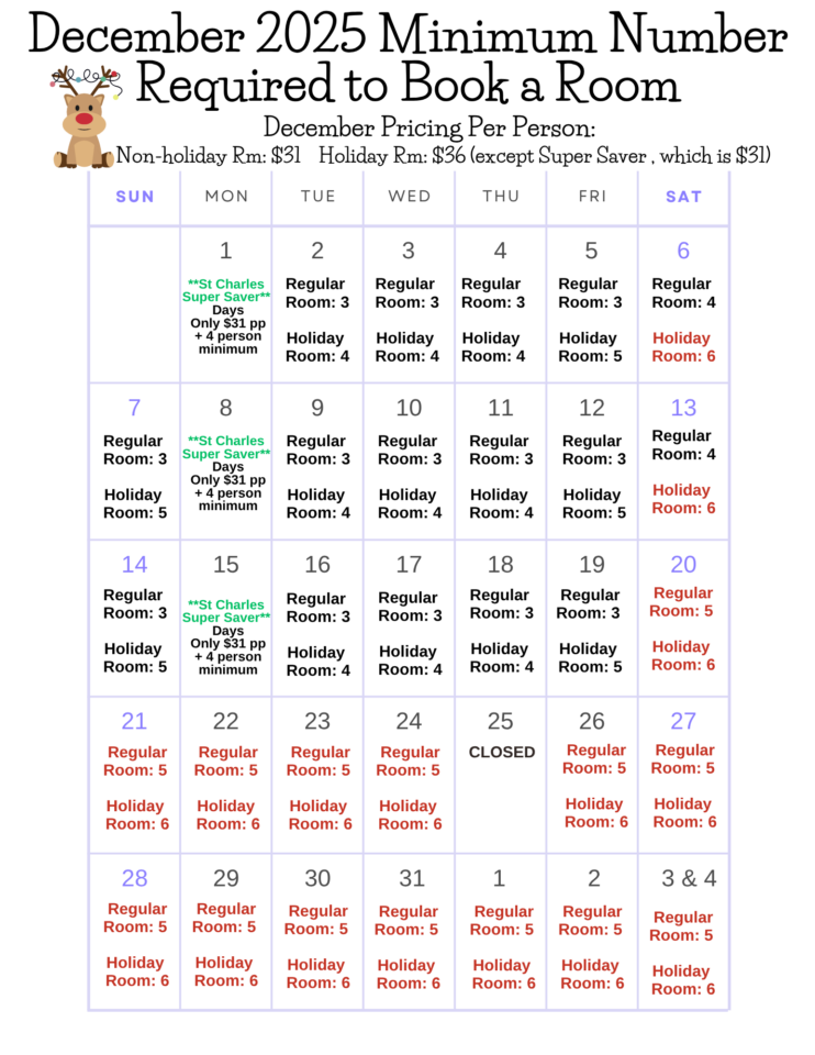 Our annual holiday pricing calendar is below! Christmas rooms are $36 per person with different minimum requirements on different dates. Holiday room Super Saver Days now available!