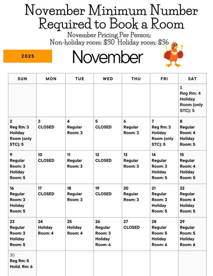 As we enter the busiest time of year for our family’s business, we have created a calendar to reflect the changing minimum initial purchase for our rooms for each date. Pricing is separated between non-holiday and holiday-themed rooms. You can see the calendar below for pricing and minimum requirements for each date.